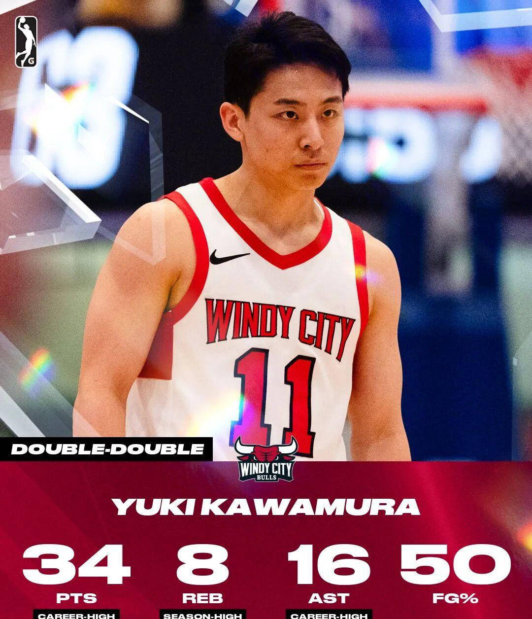身高仅有1米70、体重72公斤的河村作为一名黄种人小后卫,能在这样激烈的联赛中斩获34分、16助攻和8篮板,这样的数据在过去几乎难以想象。更重要的是,这不是河村偶尔的爆发,在此前的一场比赛中,他也展现了超强的组织能力和得分能力——那场风城公牛以133-127逆转长岛篮网,河村投篮16中5,同样贡献25分13助攻的两双数据。