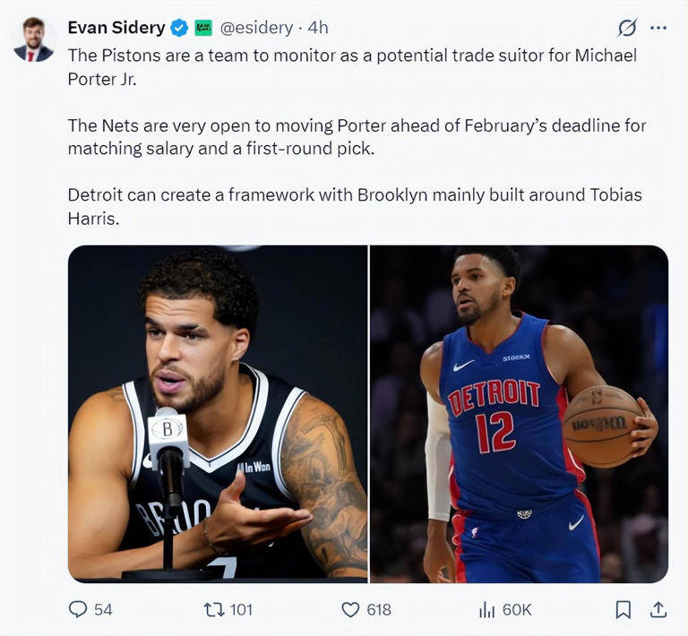 看到如此一幕,多支球队公开接触篮网队,试图询价小波特,为此管理层的做法实属反常规。据任职于ClutchPoints的篮网随队记者Erik Slater报道:底特律活塞队,这支东部刚崛起的黑马,他们对引进小波特表现出浓厚的兴趣。而布鲁克林篮网队则希望在交易截止日前,推进交易的进行,而关于后续的交易,他们只看重两点。其一,达成薪资配平的要求;其二,对方还需额外附上一个首轮选秀权。没有看错,打出身价的空间型锋线,竟然如此廉价,迫使篮网有如此魄力操作,最大的功臣在于丹佛掘金。他们不仅白送一个首轮签,而且在后续让篮网赚得盆满钵满。